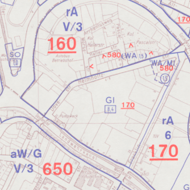 Einzelne Kartenblätter des Bodenrichtwertatlas basierend auf den Rasterdaten des Gutachterausschusses für Grundstückswerte in Berlin vom 31.12.1982. Die Bodenrichtwerte sind in DM/m² angegeben!