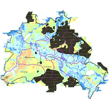 Darstellung des Flurabstandes (Abstand zwischen Geländeoberkante und freier Grundwasseroberfläche)in 7 Schichtstufen und Angabe von gespannten Grundwasserbereichen, 1:50.000, Sachstand 1995