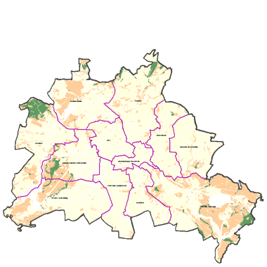 Darstellung der realen Nutzung der bebauten Flächen Berlins in 11 Kategorien und des Grün- und Freiflächenbestandes Berlins in 12 Kategorien auf Grundlage der digitalen Blockkarte 1:50000 des ISU (Infosystem Stadt und Umwelt), Darstellung generalisiert und nicht lagegetreu, Mindestflächengröße 1 ha, Sachstand 2000.