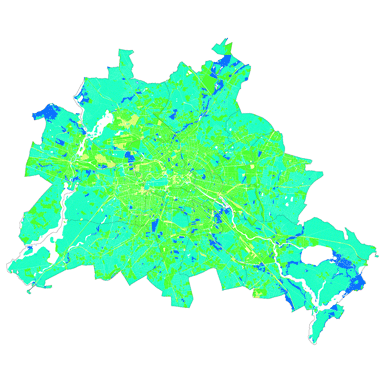 Darstellung der Kühlleistung der Böden ohne Berücksichtigung der Versiegelung (Verdunstung und Kühlenergie) auf Grundlage der Bodeneigenschaften auf Block- und Blockteilflächen-Basis, 1 : 5.000, Stand 2020.