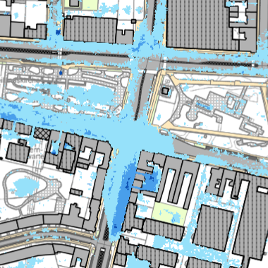 Die Starkregengefahrenkarte zeigt die räumliche Ausdehnung von Überflutungen, den Überflutungstiefen und die Fließgeschwindigkeit eines Hochwassers bei verschiedenen Starkregenszenarien (seltenes, außergewöhnliches und extremes Ereignis). In Berlin wird die Starkregengefahrenkarte auf Basis eines gekoppelten 1D-Kanalnetz- und eines 2D-Oberflächenabflussmodells (1D/2D gekoppeltes Modell) durchgeführt, wobei aktuelle Daten der Topographie, des Bodens, der Gebäude, der Versiegelung und des Kanalnetzes in der Berechnung berücksichtigt werden. Alle Informationen erfolgen ohne Gewähr für ihre Richtigkeit. In keinem Fall wird für Schäden, die sich aus der Verwendung abgerufener Informationen ergeben, Haftung übernommen.