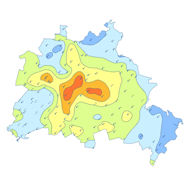 Verteilung der Grundwassertemperatur für den Bezugshorizont 0 m NHN und für 20 m unter Geländeoberfläche. In dieser Tiefe unterhalb der neutralen Zone findet absolut keine jahreszeitlich Beeinflussung durch die Sonneneinstrahlung statt. Die Erwärmung vom Stadtrand zum Stadtzentrum ist auf anthropogene Beeinflussung zurückzuführen. Die Karte basiert auf Kriging-Interpolation von Messungen an 124 Grundwassermessstellen im Jahr 2010.