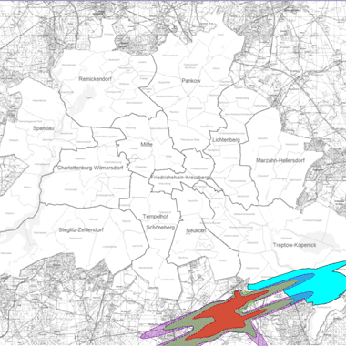 Darstellung der Lärmschutzbereiche für den Verkehrsflughafen Berlin Brandenburg einschließlich der Planungszone, in der bestimmte bauliche Nutzungsbeschränkungen gelten.