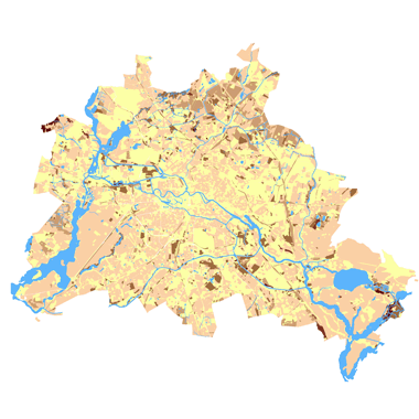 Bodengesellschaften und Bodenarten unversiegelter Böden, Konzeptkarte ermittelt aus Bodenuntersuchungen und Nutzungsarten auf Grundlage der Blockkarte 1 : 50.000 (ISU50, Raumbezug Umweltatlas 1990), Bearbeitungsstand Februar 1995.