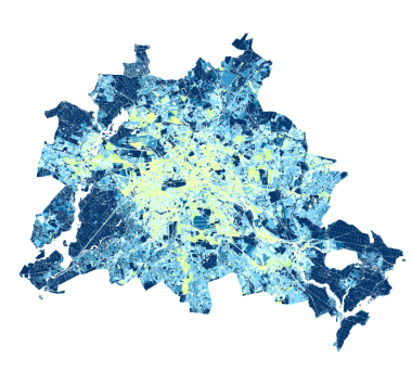 Versiegelungsgrade in 10% Stufen, aus Luft- und Satellitenbildauswertung. Raumbezug: Berlin, ca. 25.000 Baublöcke/Blockteile, 1 : 50.000, Stand 1990. Für Straßen und Gleisanlagen wird kein Versiegelungsgrad angegeben.